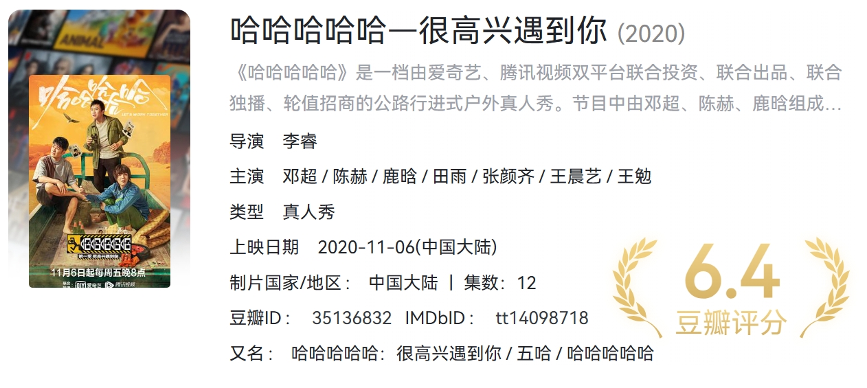 哈哈哈哈哈 第五季(持续更新中)合集 4K 国语中字 附1-4季 【约181.4GB】 栏目:影视资源 作者:笙垣 时间:2025-03-30 12:08:14 简介:五哈系列综艺,影视平台付费节目,这里持续更新。。。下载 网盘下载